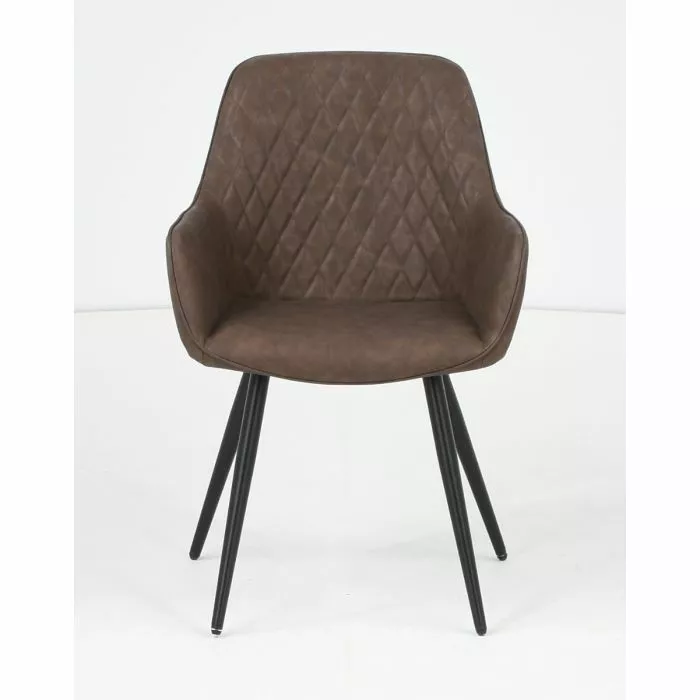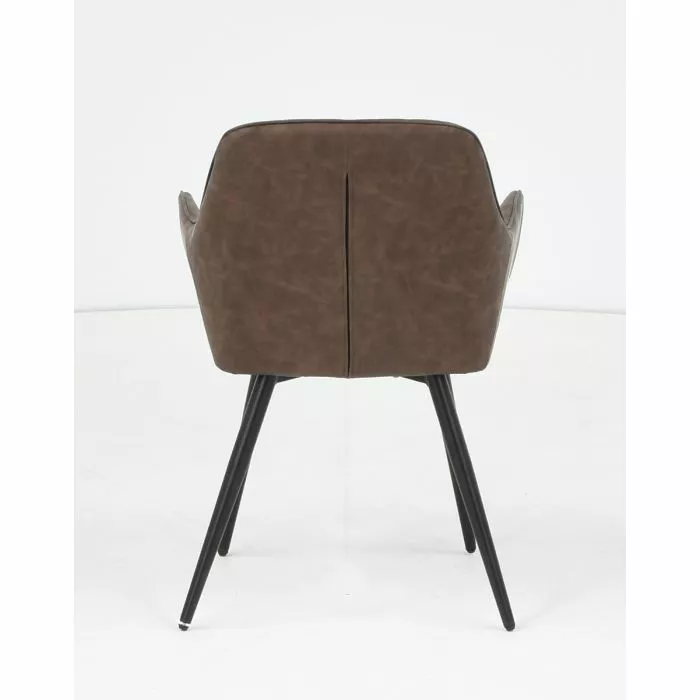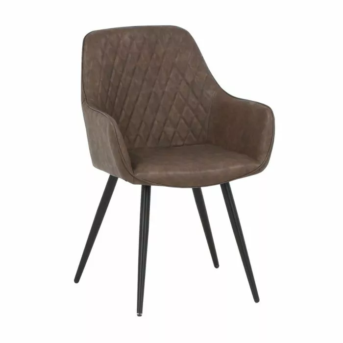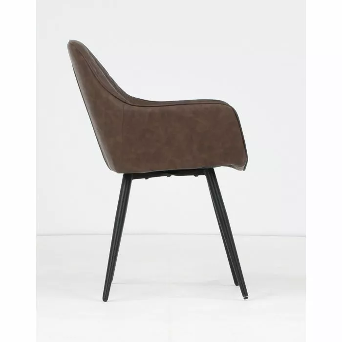 Tyylikäs ja tukeva Blake-ruokatuoli. Tuoli on verhoiltu laadukkaalla ruskealla keinonahalla ja siinä on mustat pulverimaalatut metallijalat.