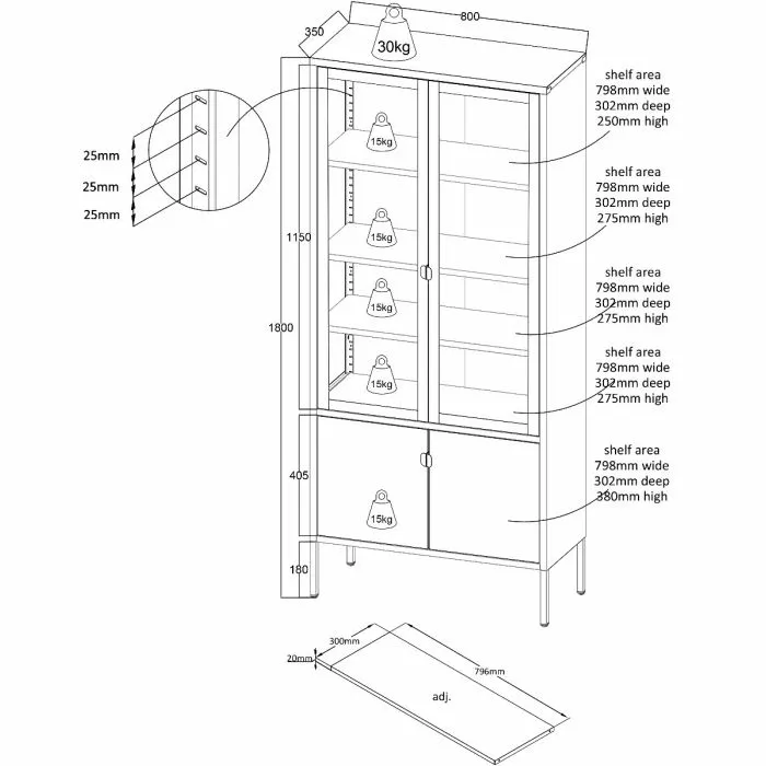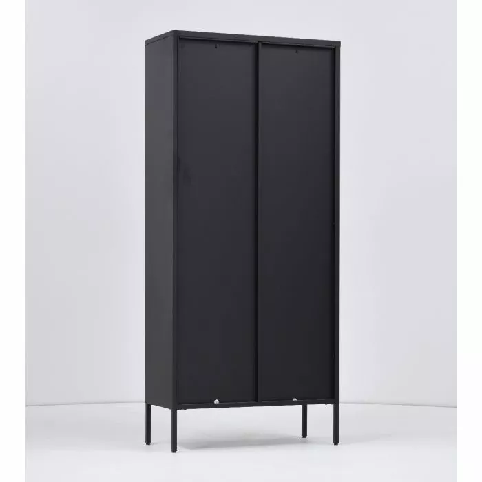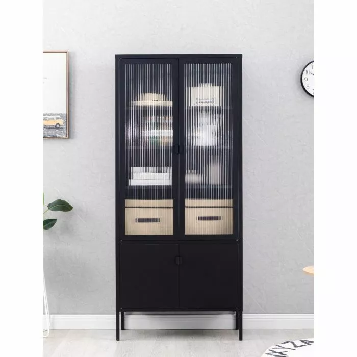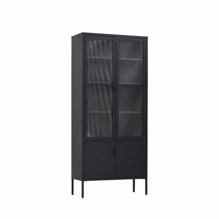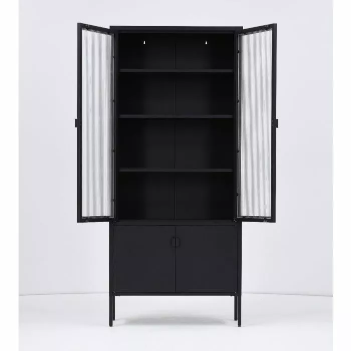 Tyylikäs metallinen korkea Carbon-vitriini, jonka yläovissa on karkaistut huurre-aaltolasit. Vitriinin sisällä on kolme säädettävää välihyllyä, joiden leveys on 79,6 cm ja syvyys 30 cm. Hyllyn kantavuus on 15 kg. Vitriinissä on myös säädettävät 18 cm korkeat jalat. Vitriinin leveys on 80 cm, syvyys 35 cm ja korkeus 180 cm.
