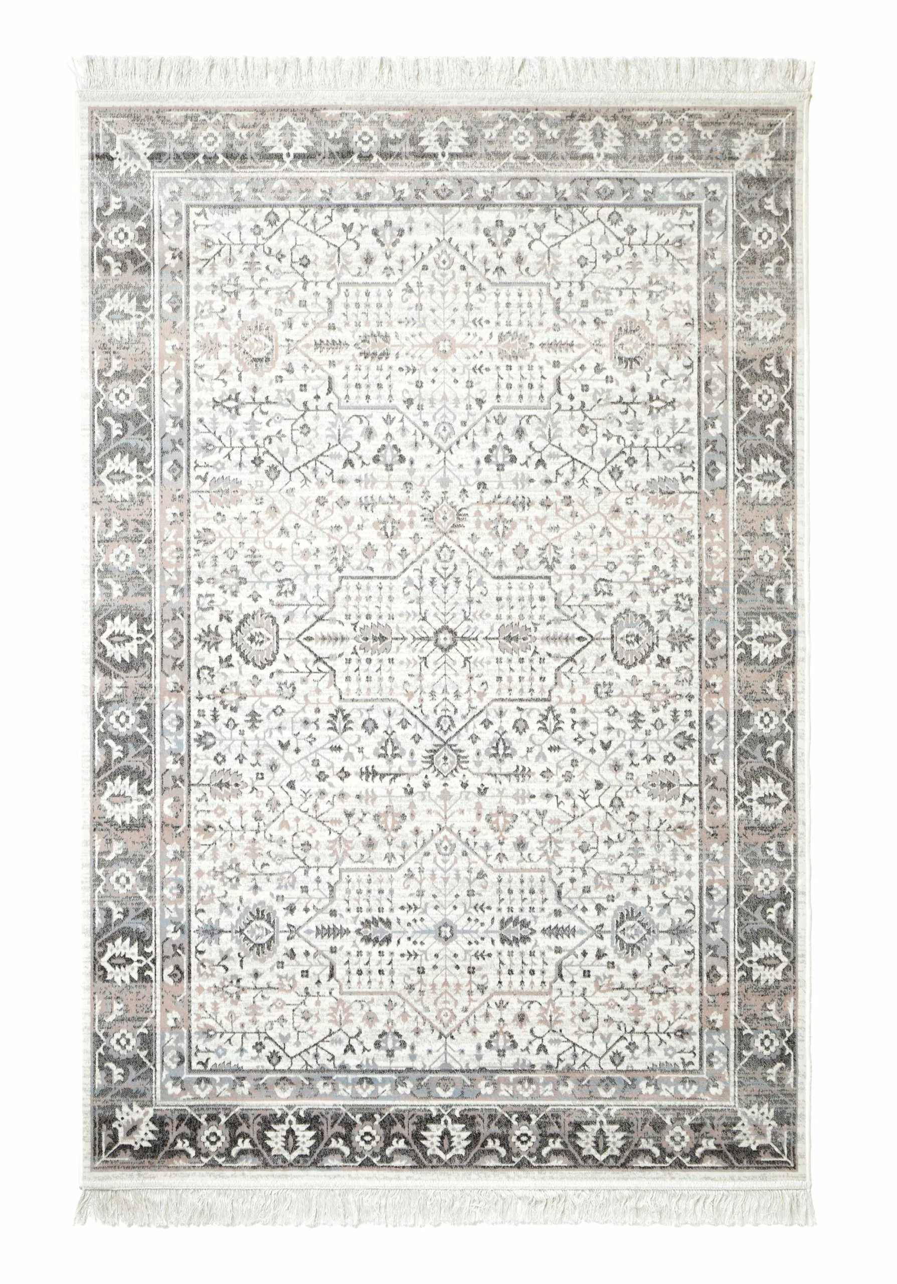 Celine-matossa on lyhyt, kauniisti valoa taittava nukka. Maton klassinen kuosi vaalealla pohjalla sopii moneen sisustukseen.