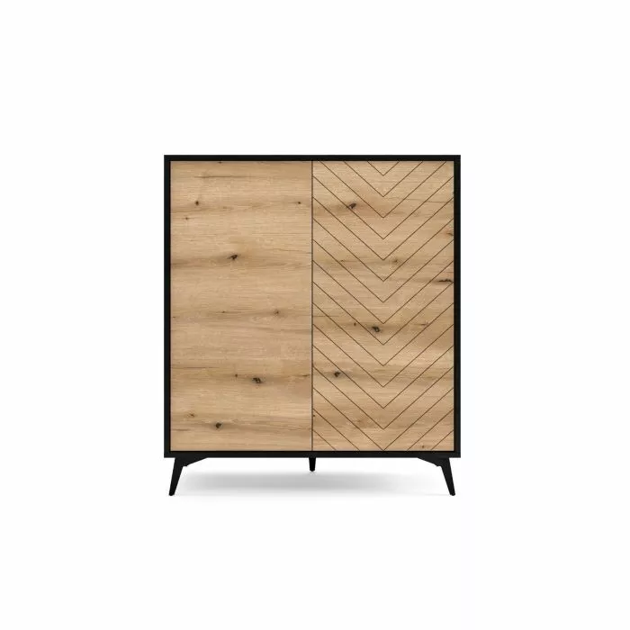 Tyylikäs ja näyttävä Dumont-kaappi, josta löytyy runsaasti säilytystilaa. Kaapissa on 16 mm laminoitu kalustelevyrunko, ABS-reunanauha sekä mustat metallijalat. Kaapin ovissa on tammen väriset etusarjat sekä oikeanpuoleisessa ovessa kaunis koristeellinen kuvio. Sisäpuolella kaksi välihyllyä väliseinän molemmilla puolilla.