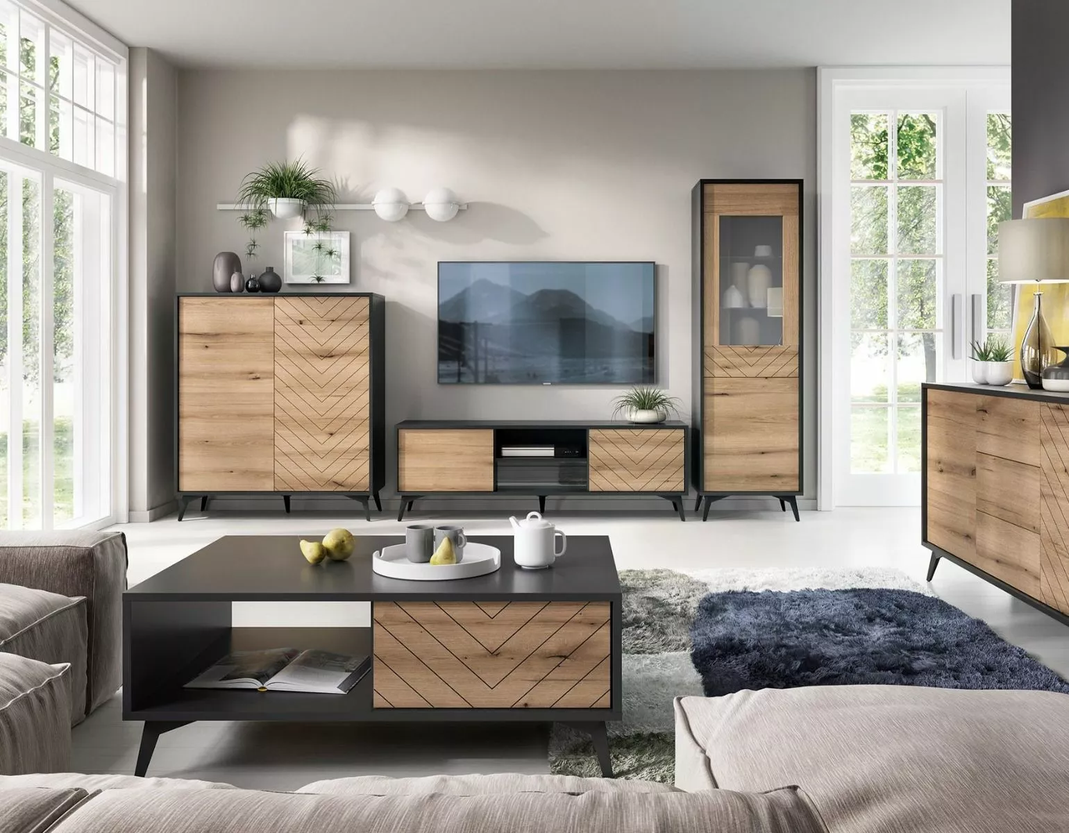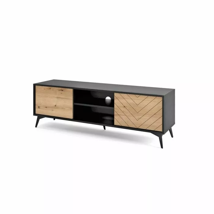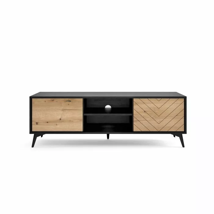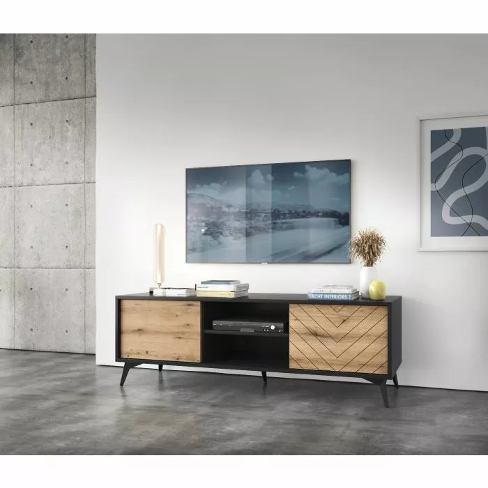 Tyylikäs ja näyttävä Dumont tv-taso, josta löytyy avohyllyt sekä kaksi kaappia. Tv-tasossa on 16 mm laminoitu kalustelevyrunko, ABS-reunanauha sekä mustat metallijalat. Kaappien ovissa on tammen väriset etusarjat sekä oikeanpuoleisessa ovessa kaunis koristeellinen kuvio. Ovissa push-to-open –mekanismi.