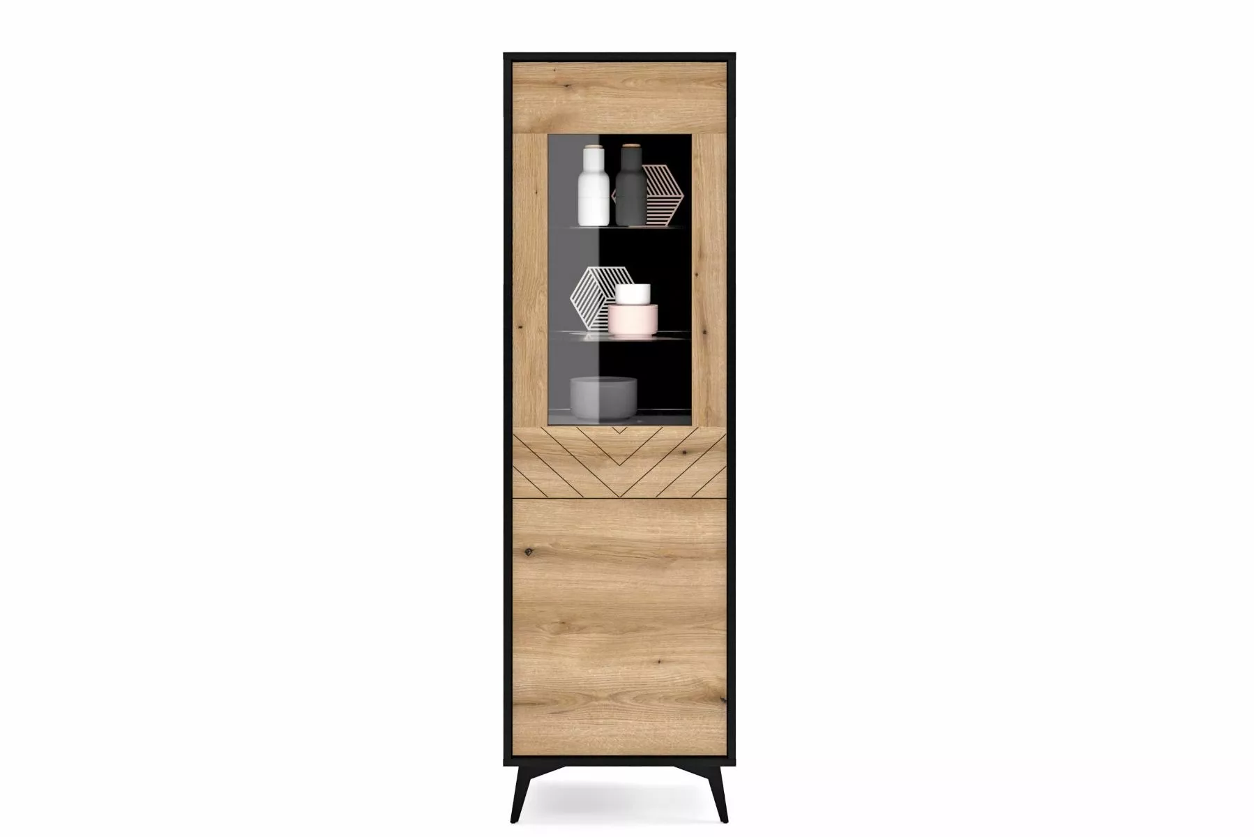 Tyylikäs ja näyttävä Dumont-vitriini. Vitriinissä on ylhäällä karkaistu lasiovi ja sen takana kaksi lasihyllyä. Alhaalla olevan kaapin sisällä on välihylly. Vitriinissä on 16 mm laminoitu kalustelevyrunko, ABS-reunanauha sekä mustat metallijalat. Vitriinin ovissa on tammen väriset etusarjat sekä kaunis koristeellinen kuvio.