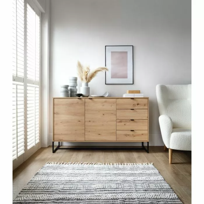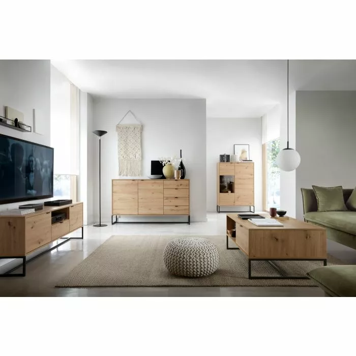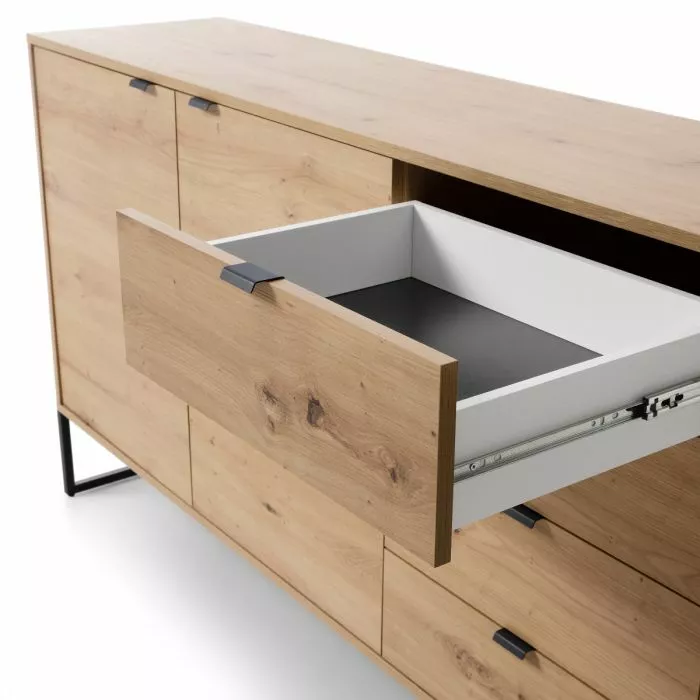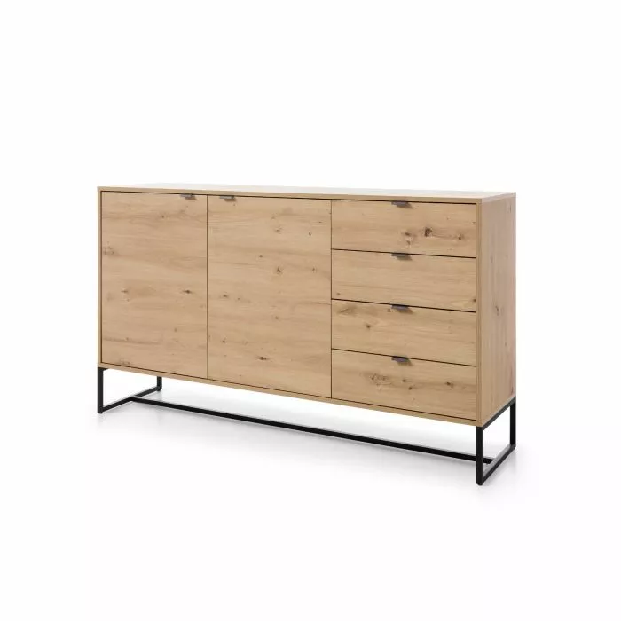 Tyylikäs tammen värinen Fore-senkki modernilla tvistillä. Senkissä on runsaasti säilytystilaa; neljä vetolaatikkoa ja kaksi kaappia, joissa on välihylly. Senkissä on tammen värinen 16 mm laminoitu kalustelevyrunko ja etusarjat, ABS-reunanauha sekä mustat metalliset jalat ja vetimet.