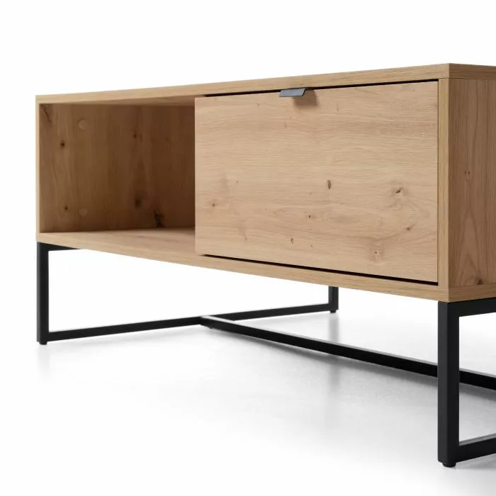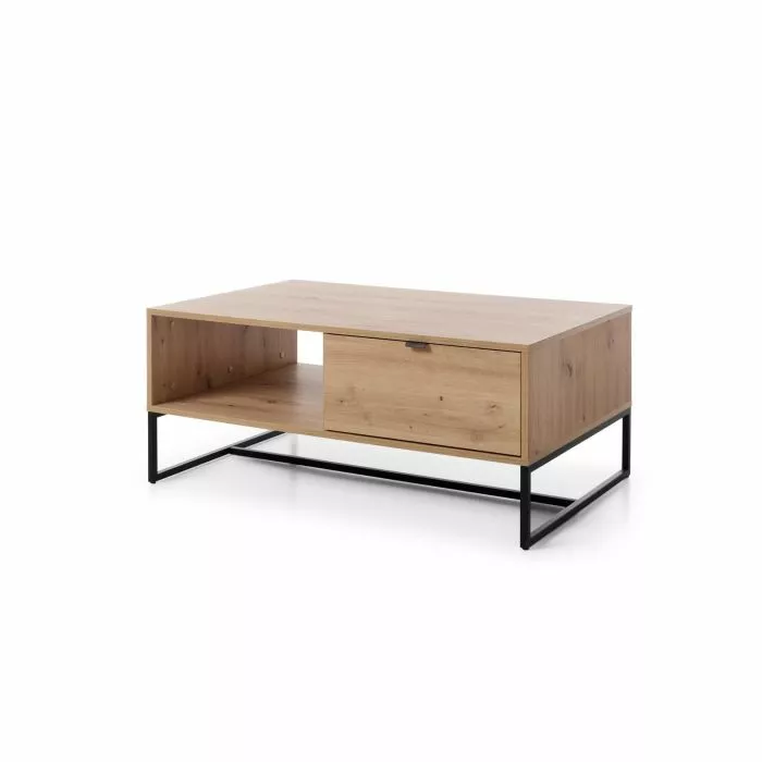 Tyylikäs tammen värinen Fore-sohvapöytä modernilla tvistillä. Sohvapöydässä on yksi vetolaatikko sekä avohylly. Sohvapöydässä on tammen värinen 16 mm laminoitu kalustelevyrunko, ABS-reunanauha sekä mustat metalliset jalat ja vetimet.