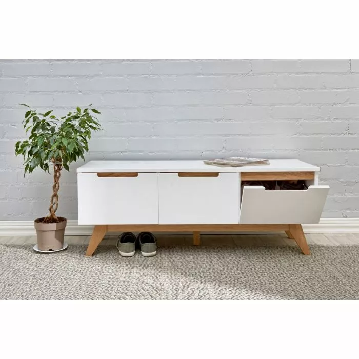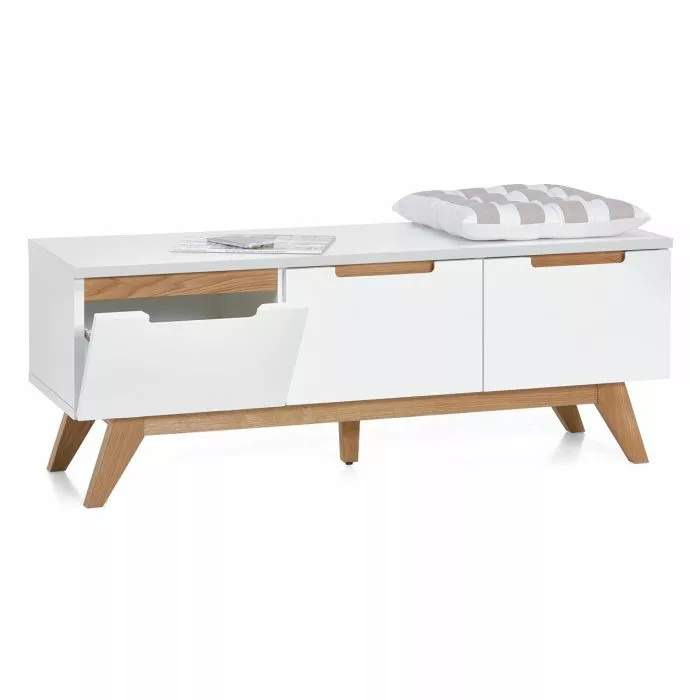 Laadukkaassa Hanko-tasossa on maalattu mdf-runko ja jalat ovat massiivitammea. Tyylikäs taso on monikäyttöinen ja se sopii hyvin esim. tv-tasoksi tai eteiseen penkiksi. Tasosta löytyy kolme säilytyskaappia, joiden ovet avautuvat eteenpäin 90°.