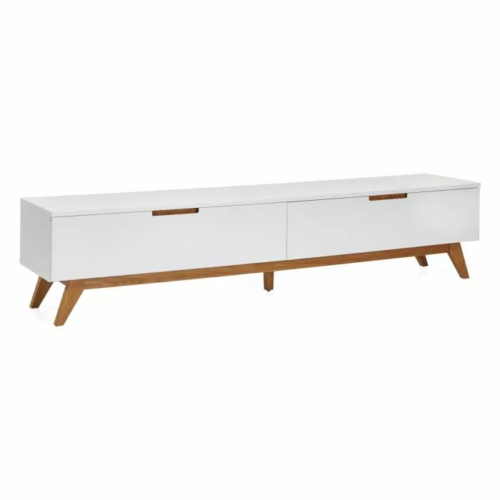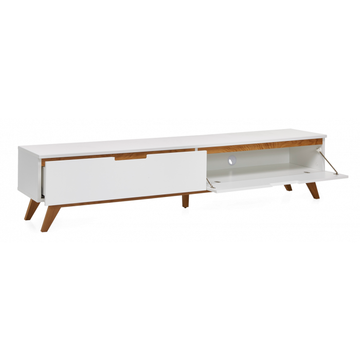 Laadukkaassa ja suoralinjaisessa Hanko tv-tasossa on maalattu mdf-runko ja jalat ovat massiivitammea. Tv-tasossa on vasemmalla puolella tilava laatikko ja oikealla puolella kippiovellinen kaappi. Laatikossa on metalliset liukukiskot.