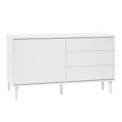 Senkki sisältää yhden kaapin leveällä välihyllyllä sekä neljä vetolaatikkoa. Senkin leveys on 153 cm, syvyys 39 cm ja korkeus 89 cm.