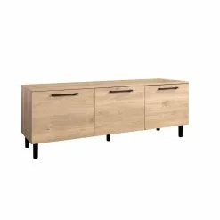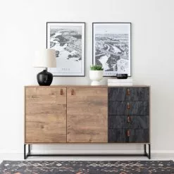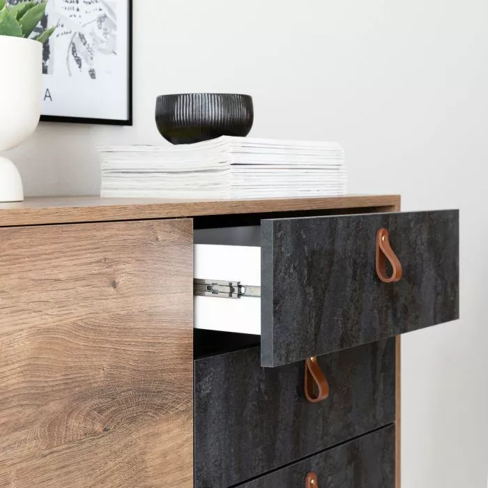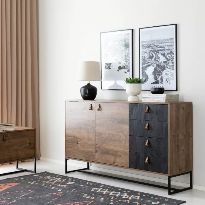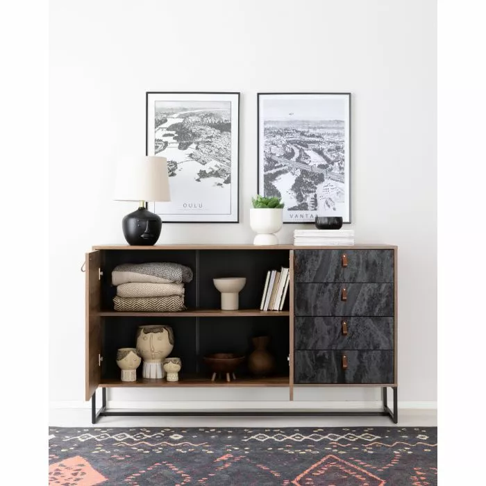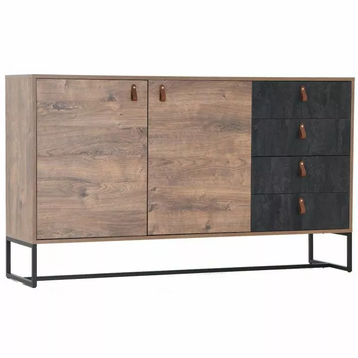Tyylikäs tammen ja harmaan värinen Kero-senkki. Senkissä on 16 mm laminoitu kalustelevyrunko, harmaat laatikon etusarjat, ABS-reunanauha, mustat metallijalat sekä ruskeat nahkavetimet.