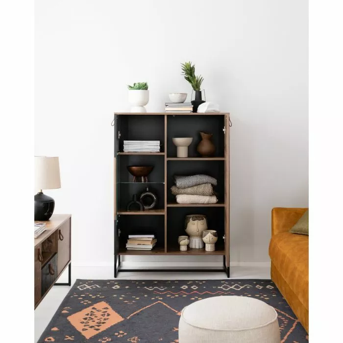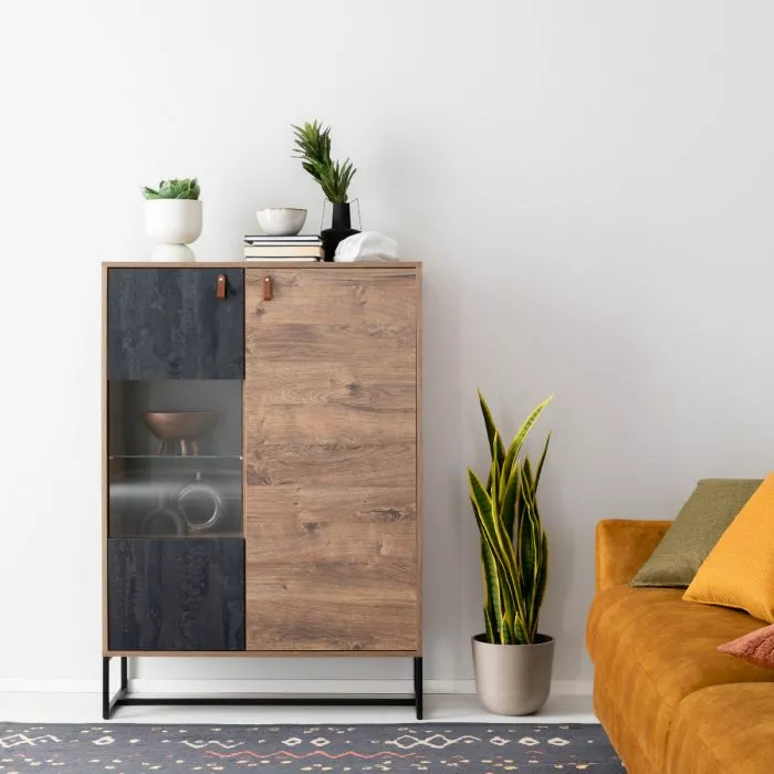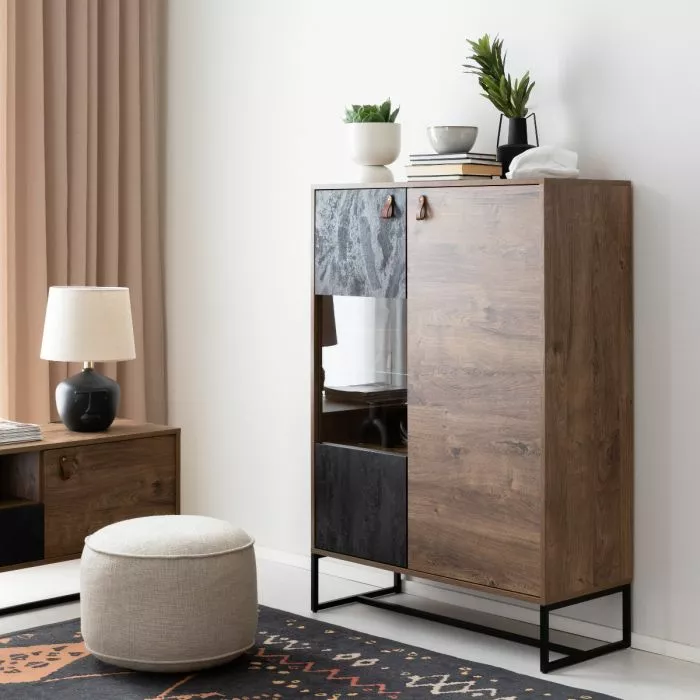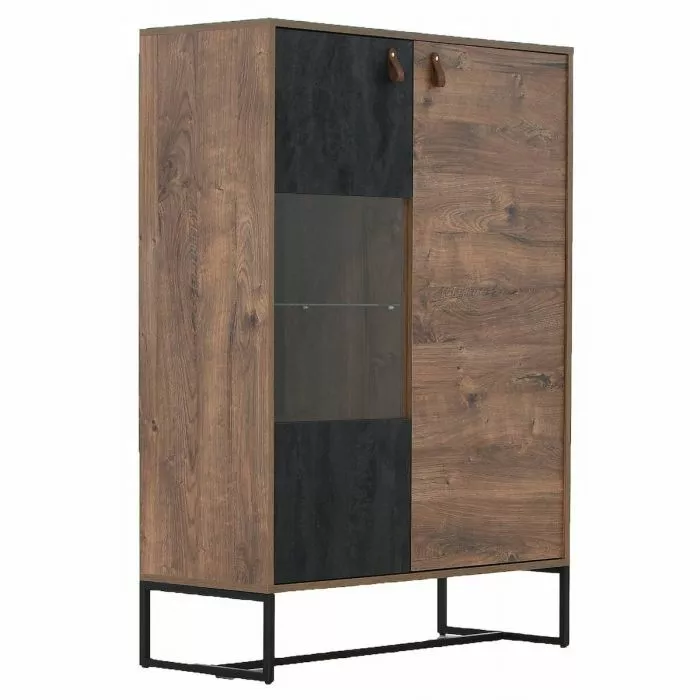 Tyylikäs tammen ja harmaan värinen Kero-vitriini. Vitriinissä on 16 mm laminoitu kalustelevyrunko, harmaa kaapin etusarja, ABS-reunanauha, mustat metallijalat sekä ruskeat nahkavetimet.