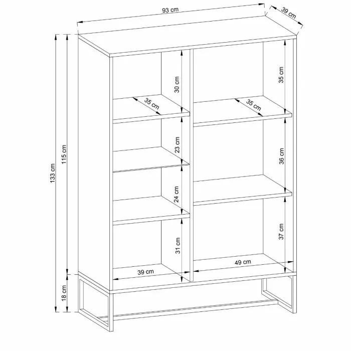 Vitriinin leveys on 93 cm, syvyys 39 cm ja korkeus 133 cm.