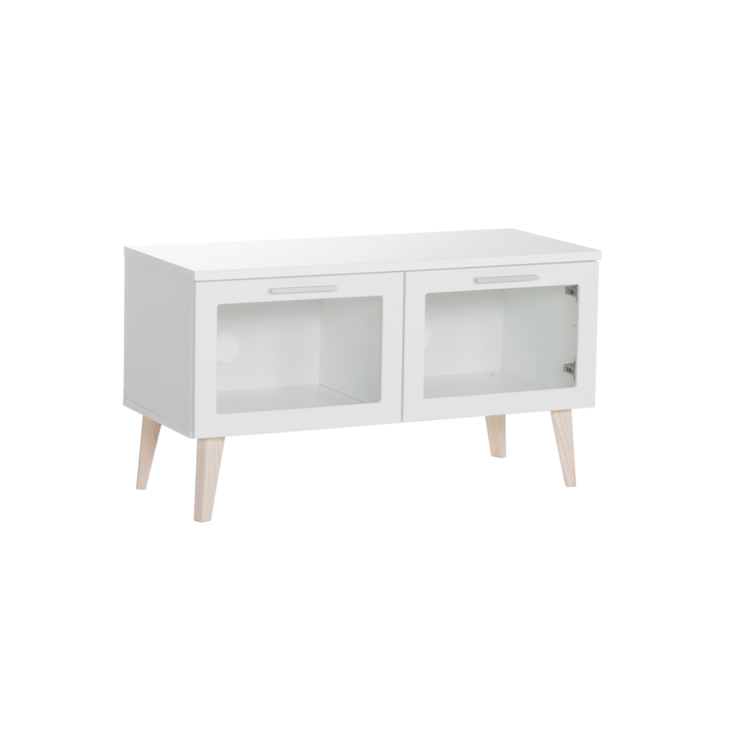 Kodikas sarjan viihdetaso on siro ja pienikokoinen tv-taso. Sopii mainiosti esimerkiksi pienenpiin huoneisiin ja yksiöihin, jossa tilaa on rajallisesti. Tv-taso tarjoaa säilytystilaa kahden lasiovi kaapin ansiosta. Korkeat, hieman viistot jalat antavat tasolle ilmavan ilmeen. Ovissa on laadukkaat hidastesaranat.