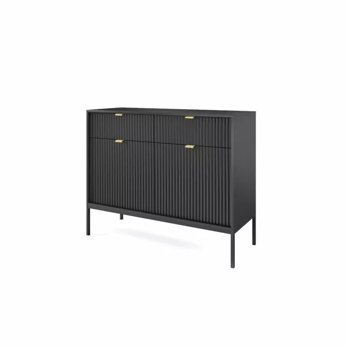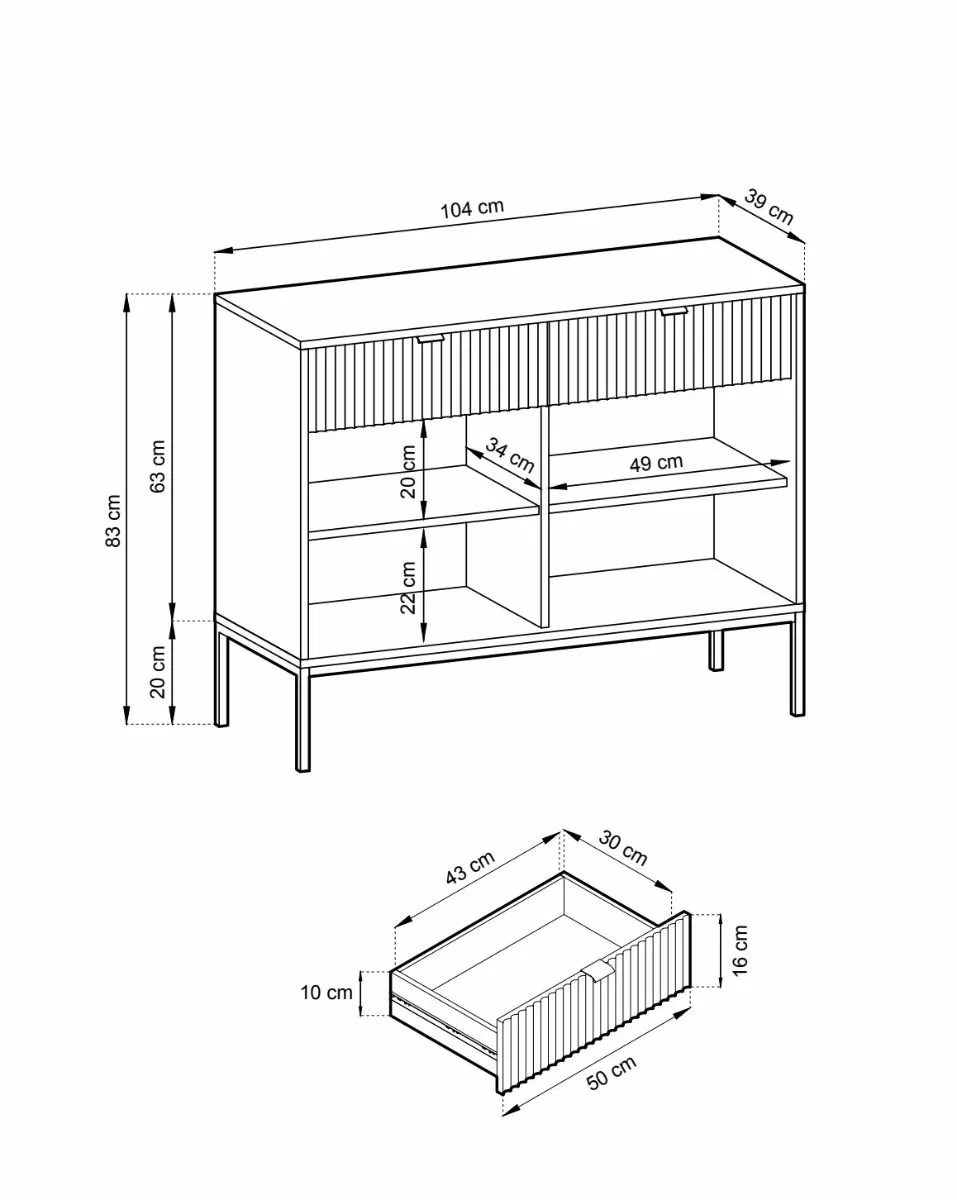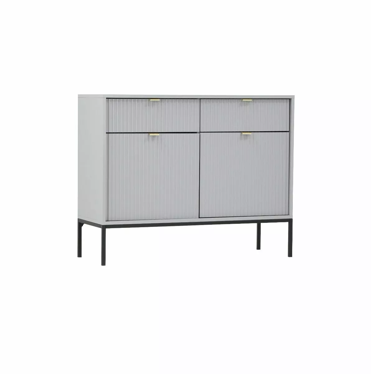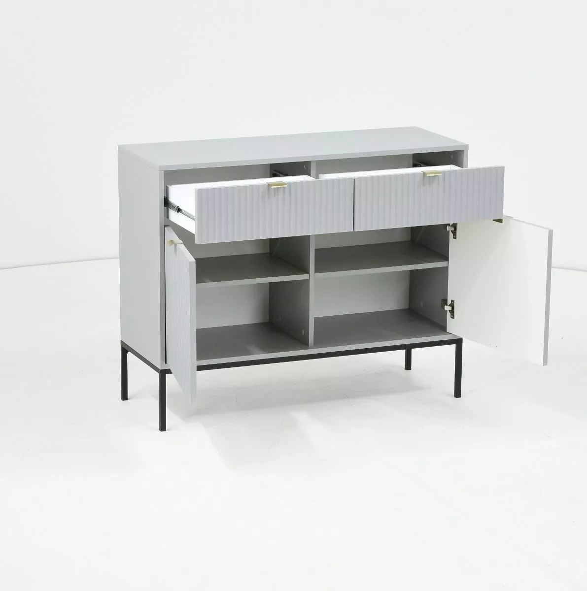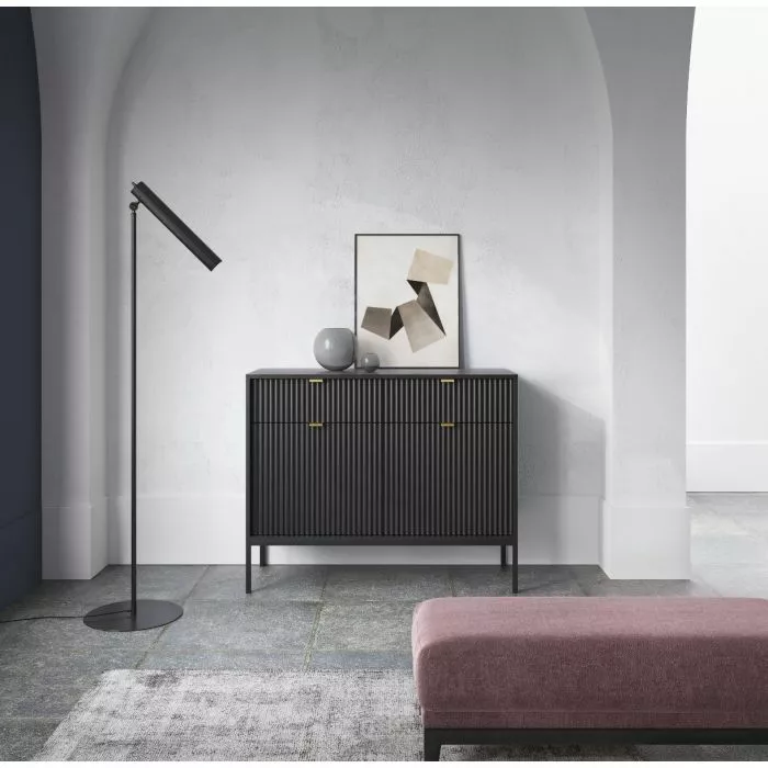 Tyylikkään ja siron Latte-lipaston saa joko harmaana, tai mustana. Lipastossa on kaksi vetolaatikkoa sekä kaappi. Kaapissa on väliseinän molemmin puolin yksi välihylly. Lipaston runko on 16 mm paksua laminoitua kalustelevyä, jossa on ABS-reunanauha. Mustat jalat ovat metallia ja niiden korkeus on 20 cm. Laatikoiden ja ovien etusarjat ovat 18 mm paksua mdf-levyä ja niissä on harjatut kullanväriset alumiinivetimet. Etusarjoissa olevat urat antavat lipastolle kauniin, yksilöllisen ilmeen. Lipaston leveys on 104 cm, syvyys 39 cm ja korkeus 83 cm.