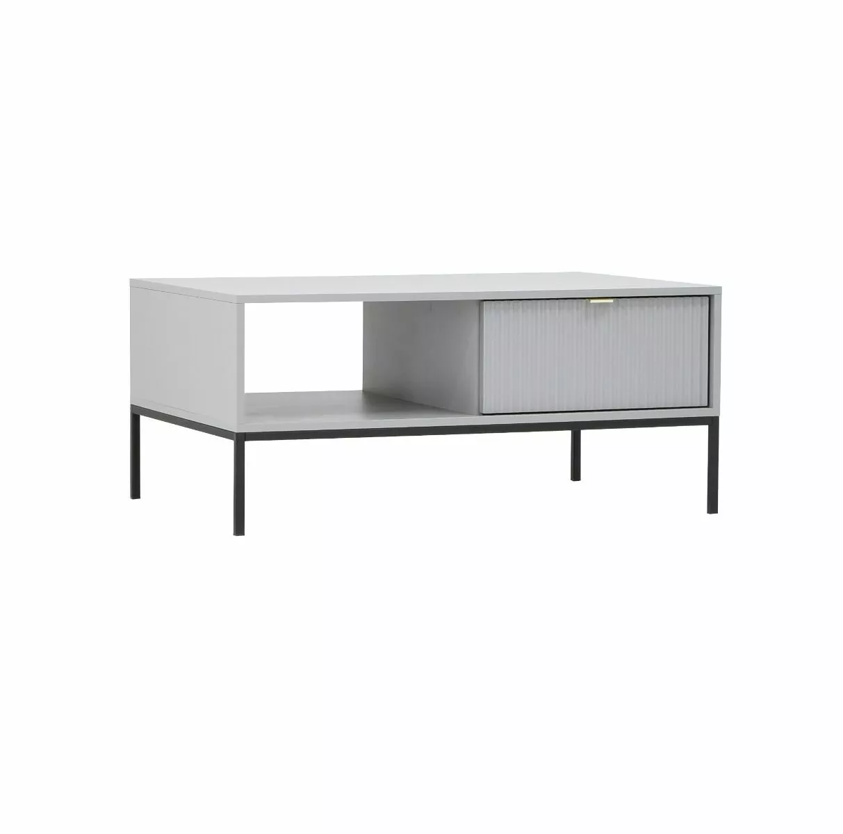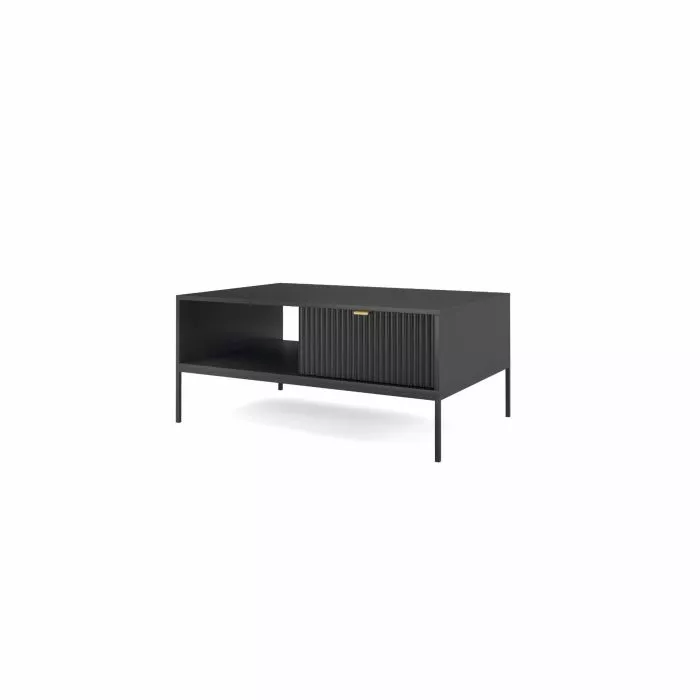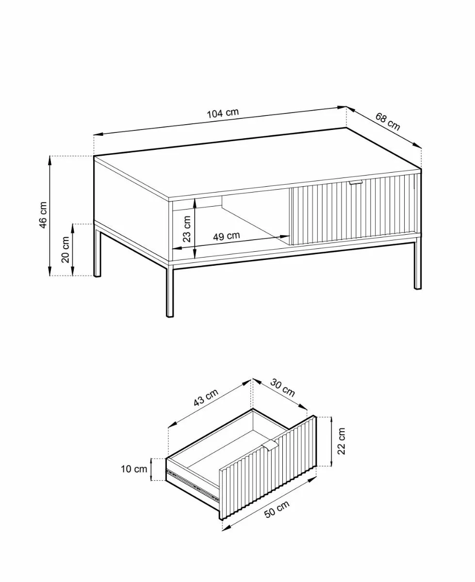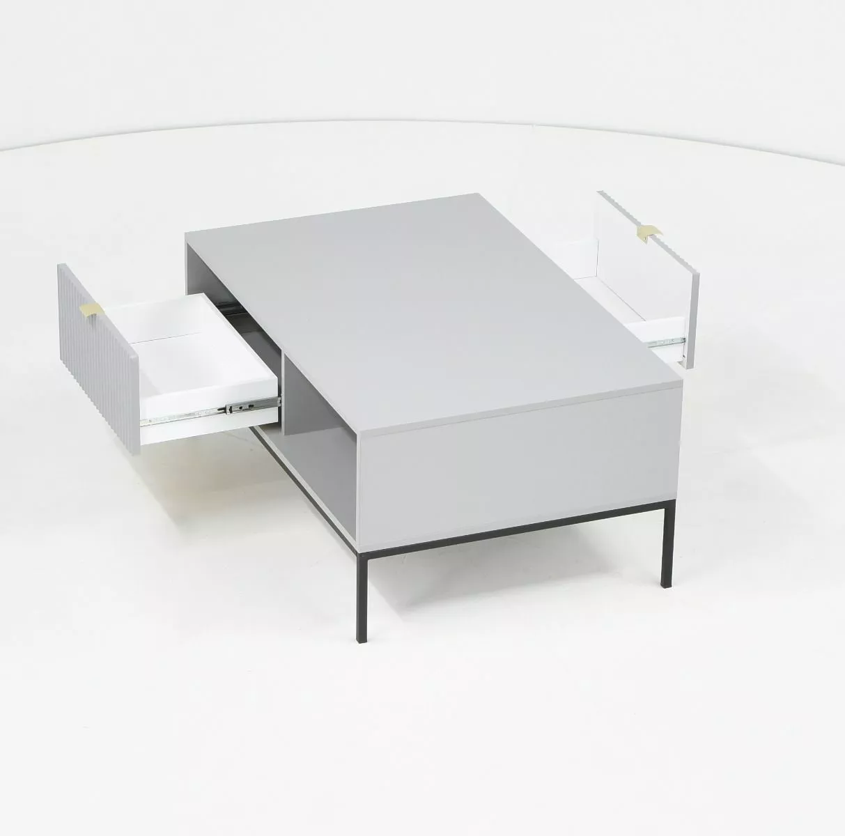 Siro Latte-sohvapöytä, jossa on kaksi vetolaatikkoa (molemmilla puolilla pöytää) sekä avohylly. Sohvapöydän saa joko mustana tai harmaana. Sohvapöydän runko on 16 mm paksua laminoitua kalustelevyä, jossa on ABS-reunanauha. Mustat jalat ovat metallia ja niiden korkeus on 20 cm. Laatikon etusarja on 18 mm paksua mdf-levyä ja siinä on harjattu kullanvärinen alumiinivedin. Etusarjassa olevat urat antavat sohvapöydälle kauniin, yksilöllisen ilmeen. Pöydän leveys on 104 cm, syvyys 68 cm ja korkeus 46 cm.