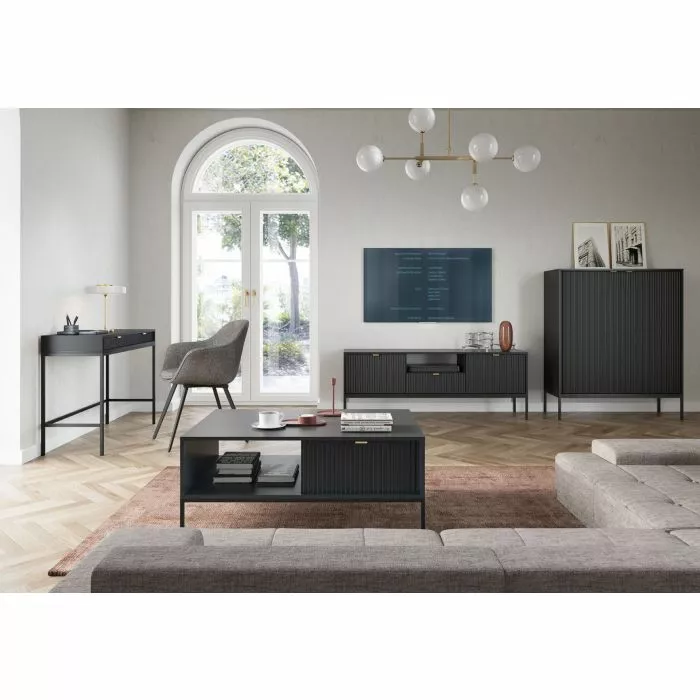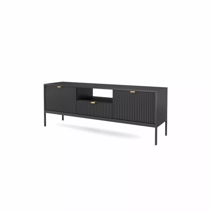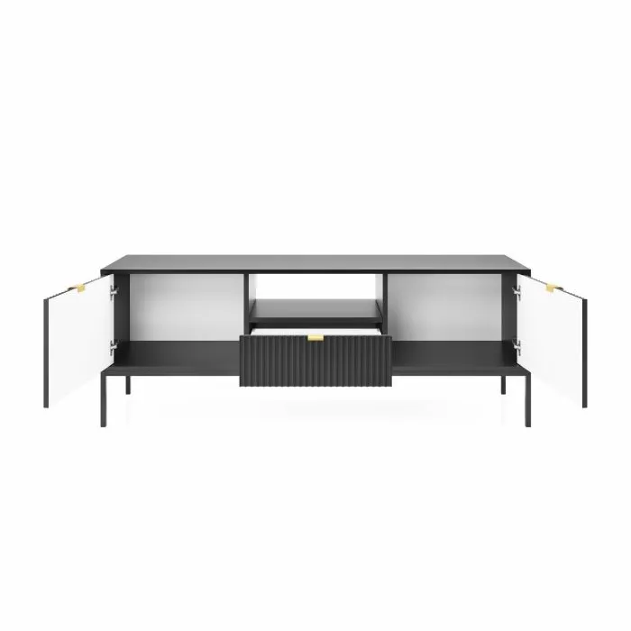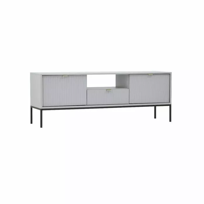 Latte tv-tasossa on yksi vetolaatikko, avohylly ja kaksi säilytyskaappia. Tv-tason runko on 16 mm paksua laminoitua kalustelevyä, jossa on ABS-reunanauha. Mustat jalat ovat metallia ja niiden korkeus on 20 cm. Laatikon ja ovien etusarjat ovat 18 mm paksua mdf-levyä ja niissä on harjatut kullanväriset alumiinivetimet. Etusarjoissa olevat urat antavat tv-tasolle kauniin, yksilöllisen ilmeen. Tv-tason leveys on 154 cm, syvyys 39 cm ja korkeus 56 cm.