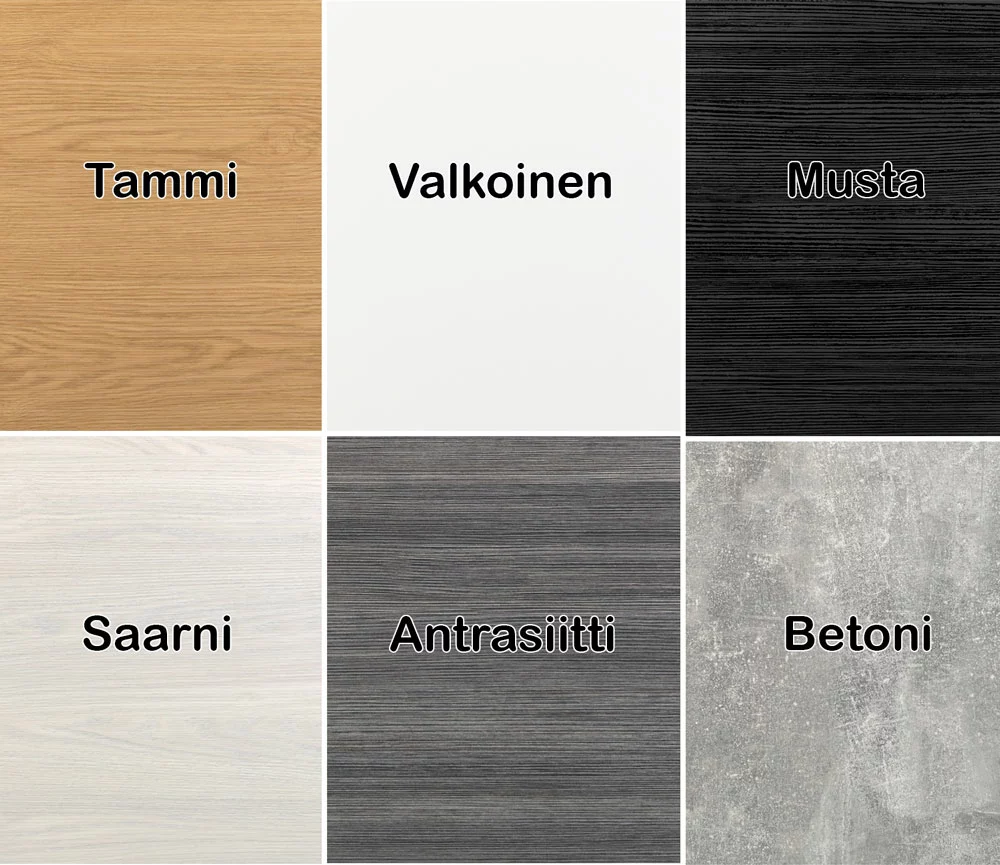Liljan rungon ja etusarjat voit valita kolmesta eri väristä: valkoinen, musta tai tammi. Kannen saa valita kuudesta eri väristä: valkoinen, saarni, tammi, betoni, antrasiitti ja musta.