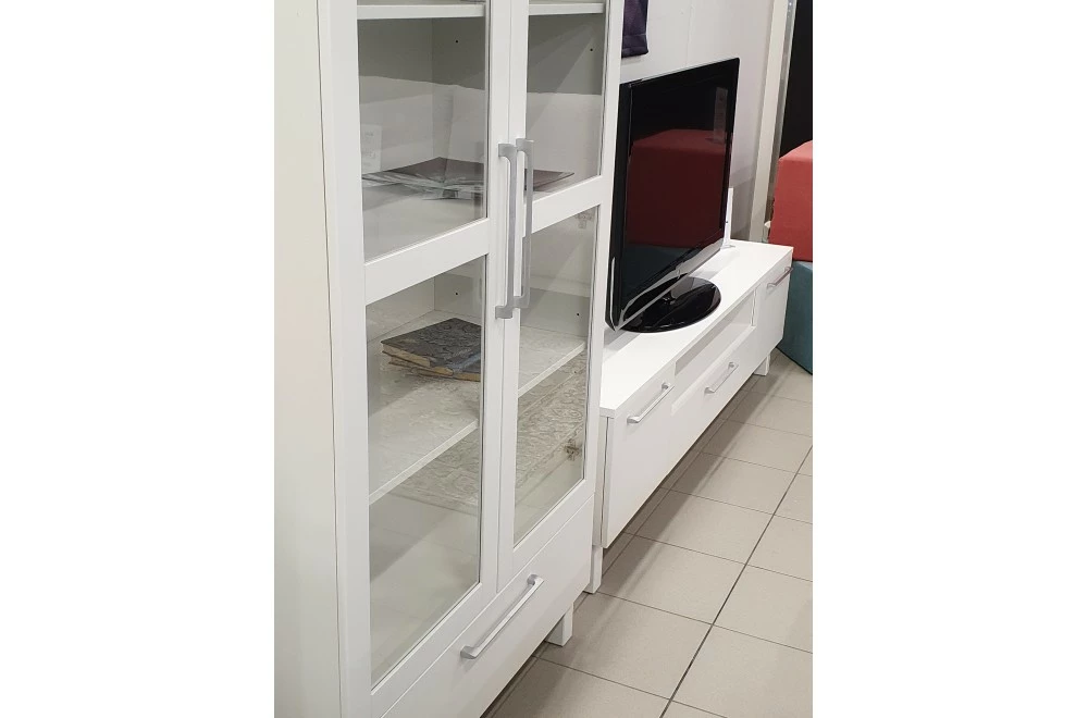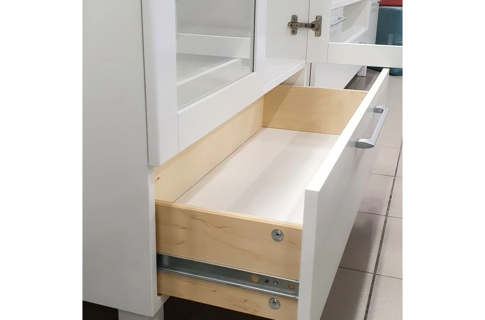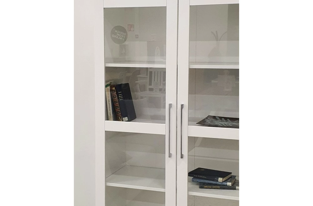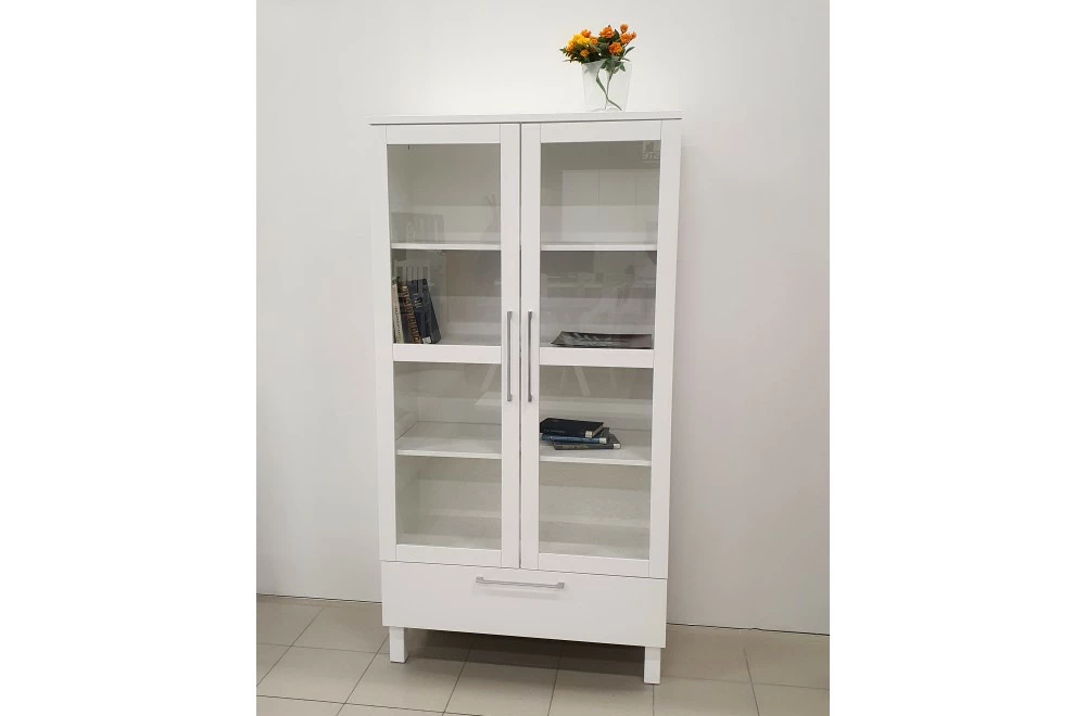 Tyylikäs Lumme vitriini saranaovilla. Lasiovien takana reilusti säilytystilaa, niin kuin myös leveässä alalaatikossa. Materiaaleina on käytetty vaneria ja kalustelevyä, jalka on puuta. Laatikossa on laadukkaat leveät metallikiskot.