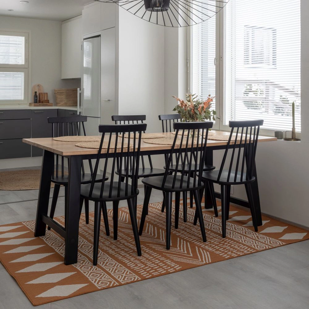 Luoto matossa on kaunis symmetrinen kuviointi. Luoto matto on kevyt ja helppohoitoinen joka kodin yleismatto. Matto on valmistettu kierrätysmateriaaleista, esimerkiksi maton 160x230cm valmistukseen on käytetty 95 kpl:tta 0,5 L muovipulloa. Maton sileästä pinnasta on helppo imuroida murut ja pyyhkiä tahrat kostealla liinalla. Voit käyttää mattoa sisällä sekä illalla.