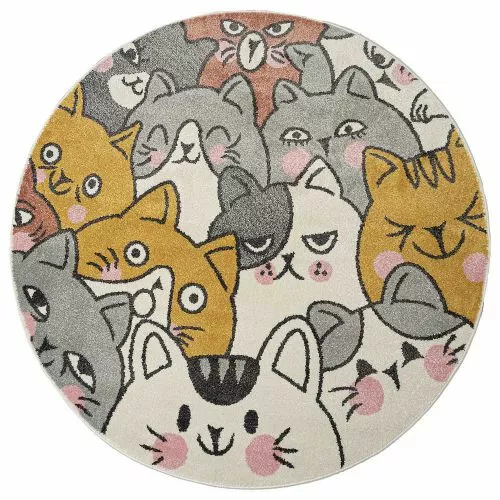 Veikeäilmeinen kissamatto perheen pienimmille. Kauniit värit ja pyöreä muoto on helppo yhdistää lastenhuoneen muuhun sisustukseen.