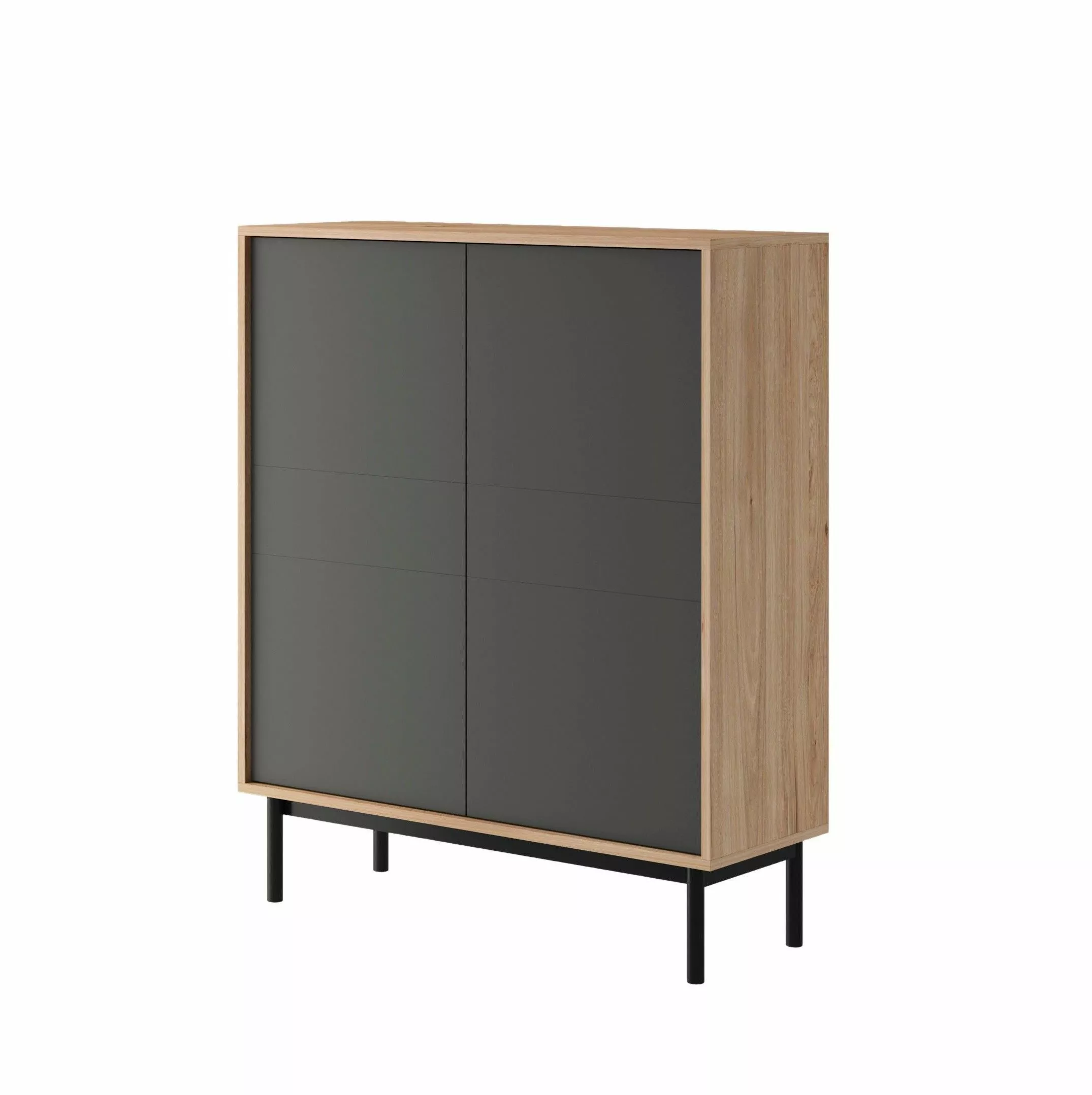 Tyylikäs ja moderni Milo-kaappi, jossa on runsaasti säilytystilaa. Kaapissa on tammen värinen 18 mm laminoitu kalustelevyrunko, harmaat etusarjat, ABS-reunanauha sekä mustaksi maalatut puujalat.