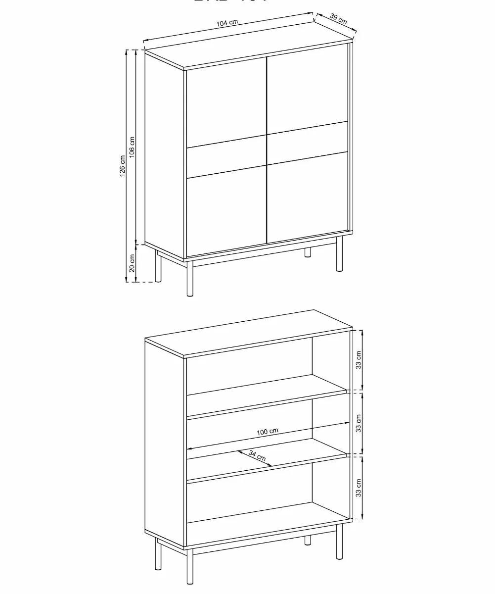Kaapissa on kaksi ovea ja kaapin sisällä kaksi leveää välihyllyä. Ovissa on push-to-open –mekanismi.