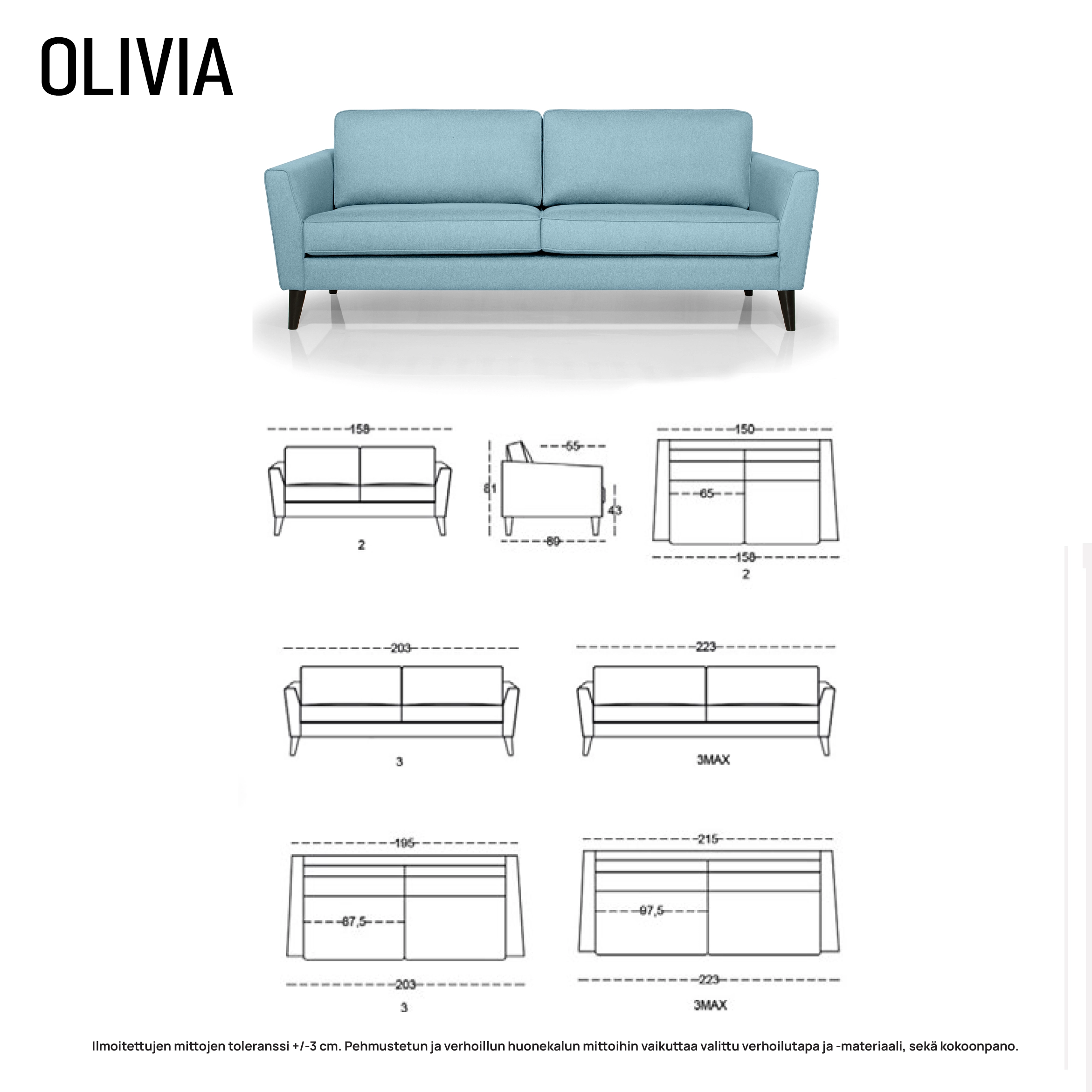 3max: Leveys 223, Syvyys 89 cm, Istumasyvyys 55 cm, Istumakorkeus 43 cm