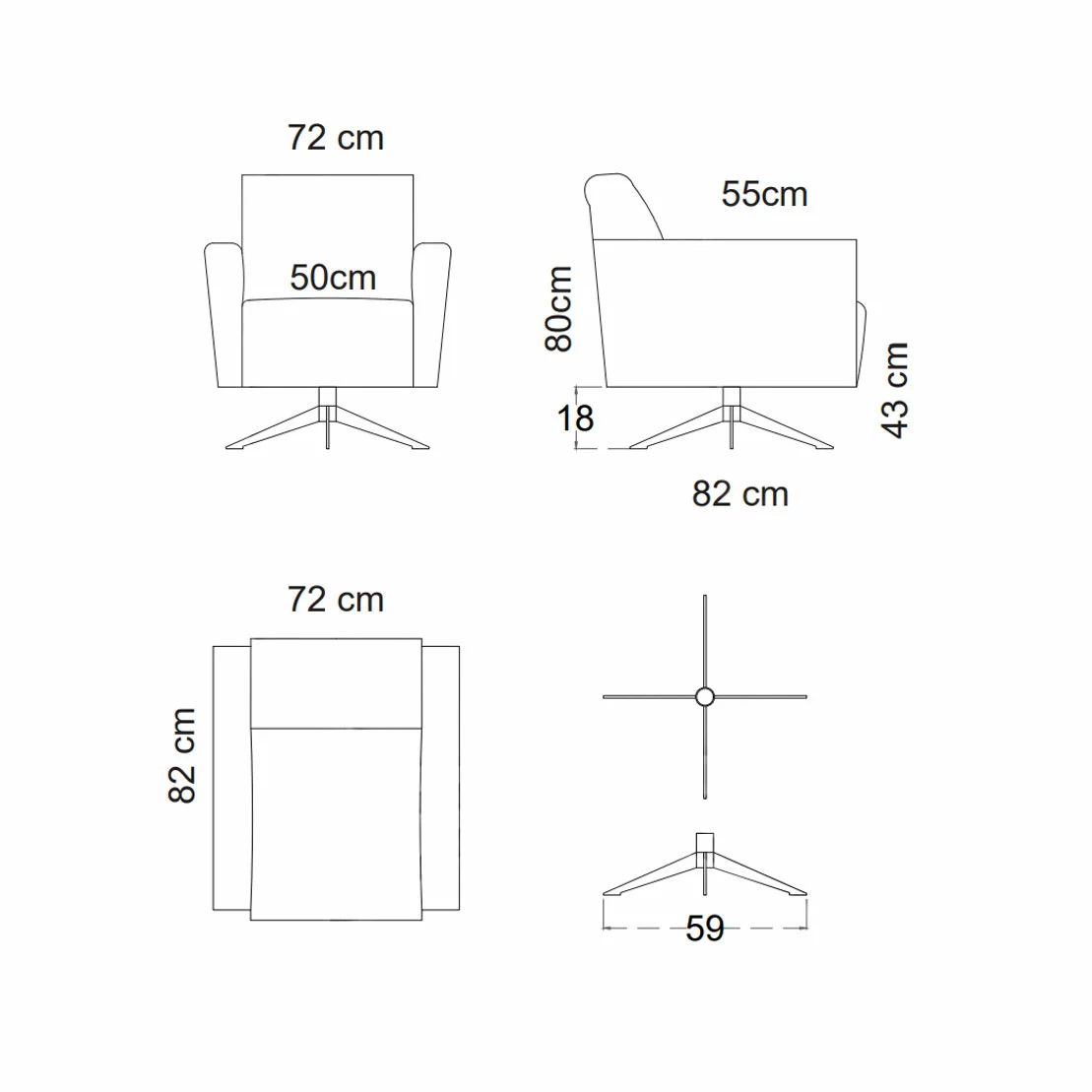 Mitat: Kokonaiskorkeus 80 cm, -syvyys 82 cm, ja -leveys käsinojien kanssa 72 cm. Istumasyvyys on 55 cm, istumakorkeus on 43 cm, ja istumaleveys 50 cm.