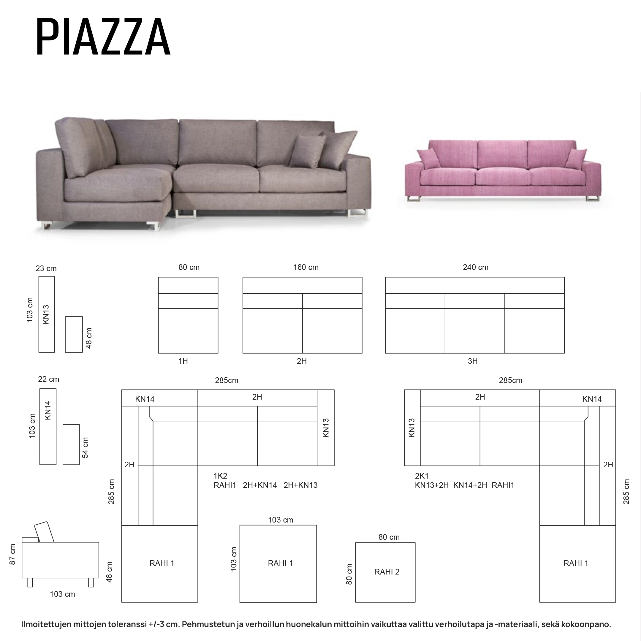 Leveys 286, Syvyys 103 cm, Istumasyvyys 62 cm, Istumakorkeus 48 cm