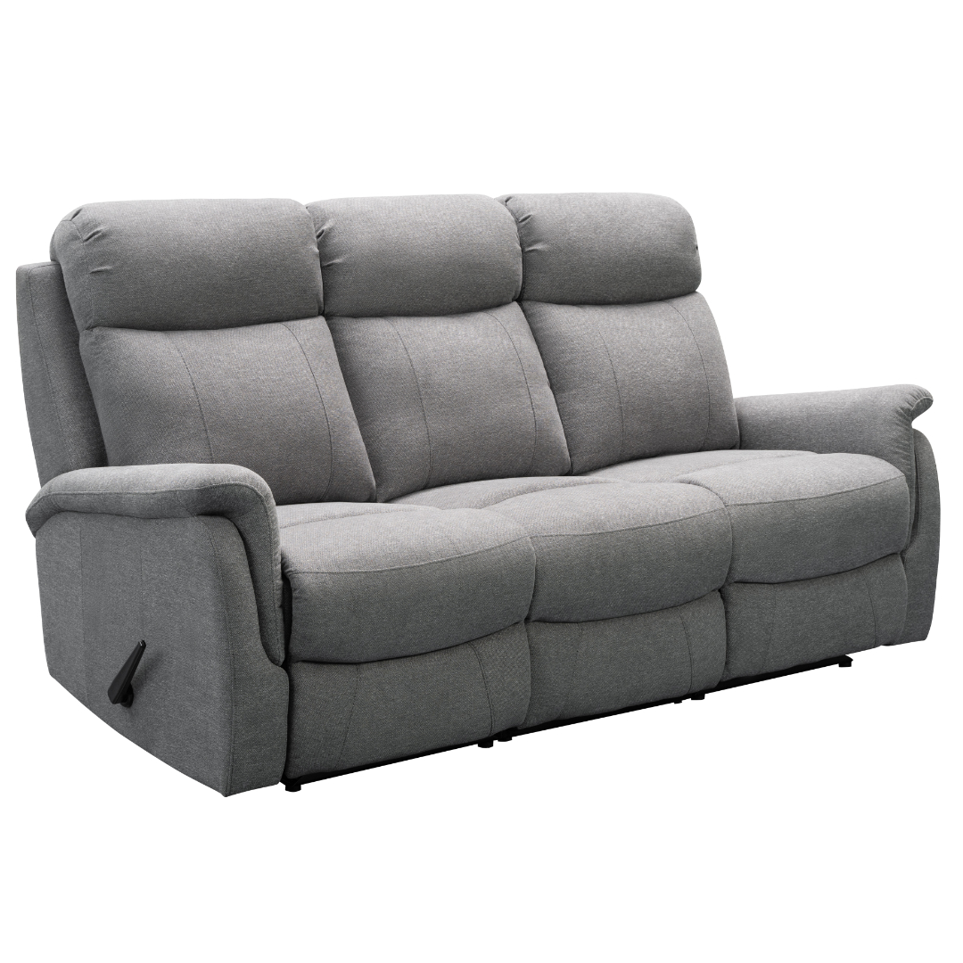 Recliner-sohva on verhoiltu harmaalla Friday-huonekalukankaalla.