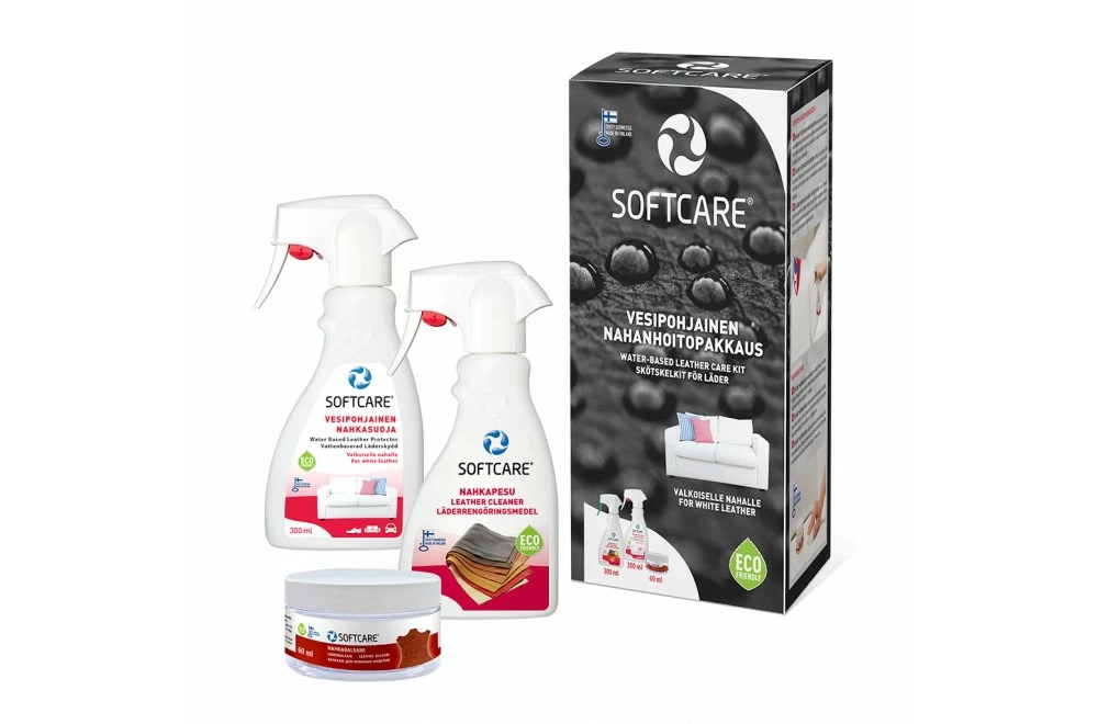 Softcare vesipohjainen nahanhoitopakkaus valkoiselle nahalle sisältää kaiken mitä tarvitse nahkakalusteiden hoitoon: tehokkaan vesipohjaisen nahkasuojan erityisesti valkoiselle nahalle, joka sopii myös muille nahan väreille, korkeatasoisen valkoisen nahan pesuaineen ja nahkabalsamin sekä froteeliinan.