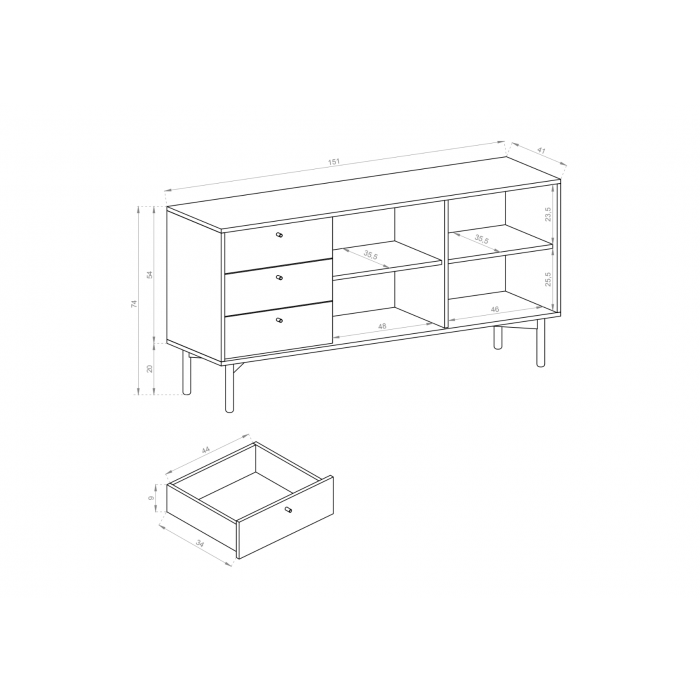 Senkistä löytyy kolme vetolaatikkoa sekä kaksi ovea, joiden sisällä on välihyllyt. Oikeanpuoleisessa ovessa on push-to-open -mekanismi. Senkin leveys on 151 cm, syvyys 41 cm ja korkeus 74 cm.