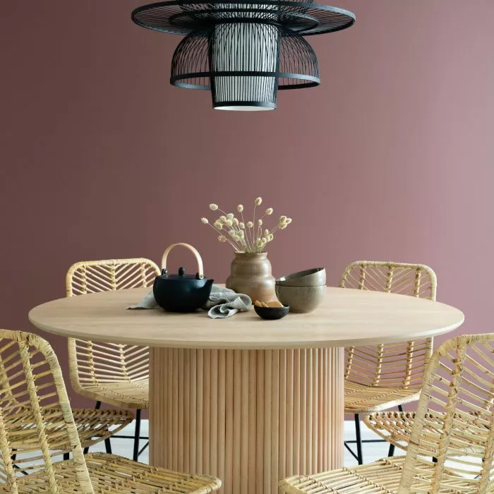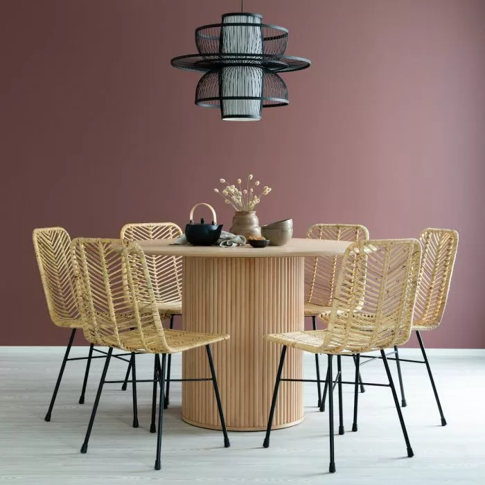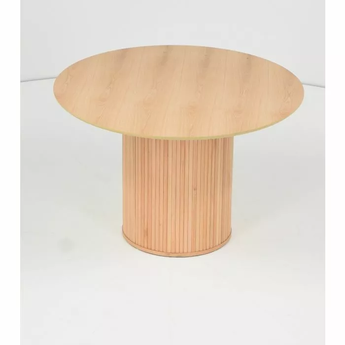 Upea, luonnonvärinen Verso-ruokapöytä, jonka jalka on koristeltu pyökkirimoilla. Jalan ansiosta pöytä soveltuu kuudelle hengelle. Pöydän runko on mdf-levyä ja tammiviilua. Pöydän halkaisija on 120 cm ja korkeus 75 cm. Paino on 39,5 kg.