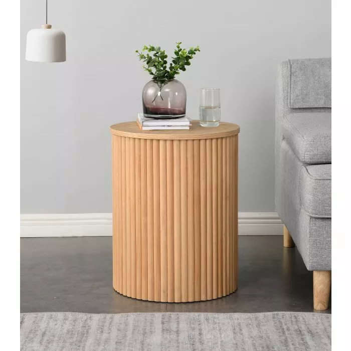 Monikäyttöinen, luonnonvärinen Verso-sohvapöytä, jonka reunat on koristeltu pyökkirimoilla. Tämä pöytä soveltuu hyvin myös sivupöydäksi. Pöydän runko on mdf-levyä ja tammiviilua. Pöydän halkaisija on 40 cm ja korkeus 50 cm. Paino on 6,6 kg.